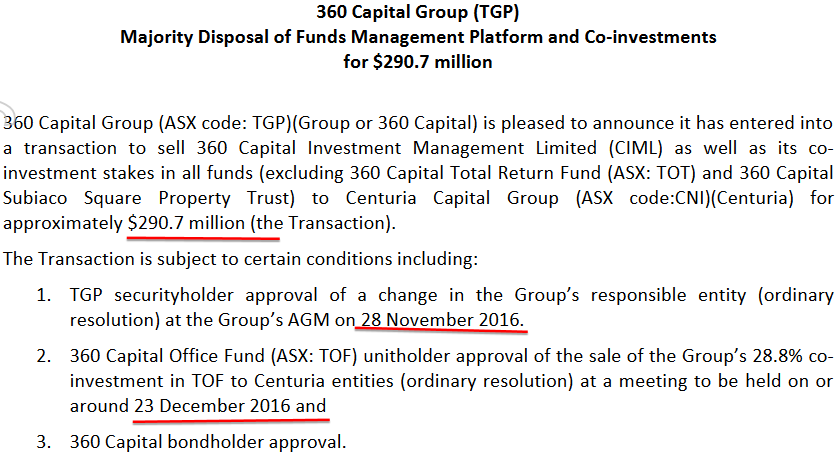 23/11/2016 centuria (ASX: CMA) has entered into a unit sale agreement to purchase 360CIML (360 Capital Investment Management Limited) and all the TOF ( Capital Office Fund) units that 360 Capital owns for approximately $47.4 million (28.8% of TOF Units)
