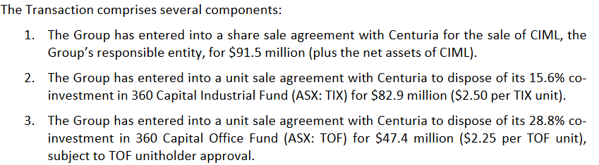 * Entered into a transaction to sell 360 Capital Investment Management Limited (CIML) as well as its coinvestment stakes in all funds to Centuria Capital Group