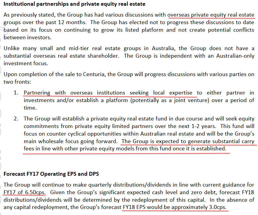 * Post the transaction, group’s NTA per security expected to increase about 36.2% from $0.69 per security as at 30 June 2016 to $0.94 per security