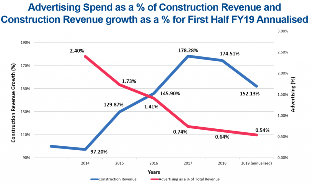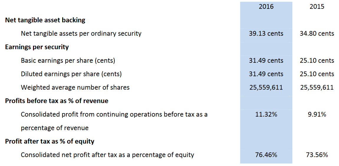 - Construction revenue increased by 12.34% with a reduction in construction and administration overheads of 10% as a percentage of revenue including the absorption of all costs associated with the closure of Melbourne and Adelaide offices.