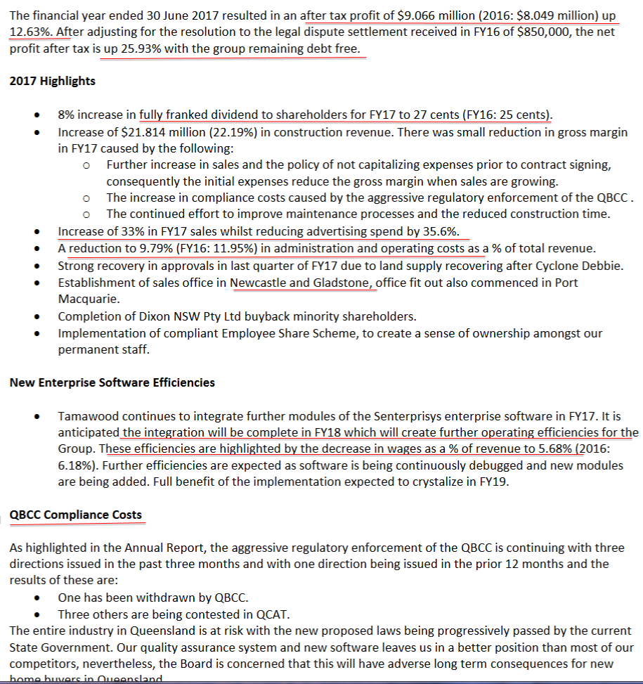 5/12/2016 Due to favourable weather conditions and the hard work of staff and subcontractors in reducing construction times, the Board and management are proud to announce that the unaudited year to date 2017 net profit before tax is in excess of 10% on the previous profit upgrade forecast announced to market on 4 November 2016. Of course, if these favourable weather conditions change, it may have a negative impact on future results.