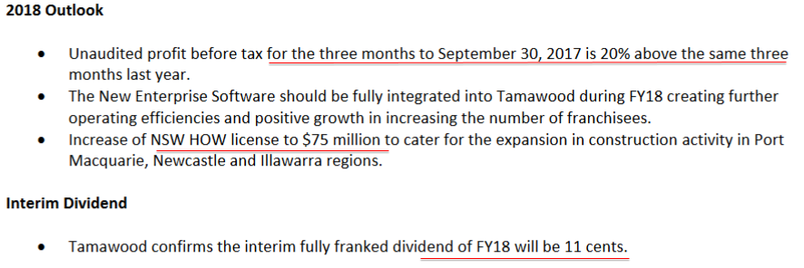 17March 2020 The Tamawood fully franked interim dividend of 12 cents will be paid on 30 April 2020.