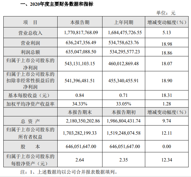 答:2020 年公司营收同比增长 5.13%,利润同比增长 18.98%,保