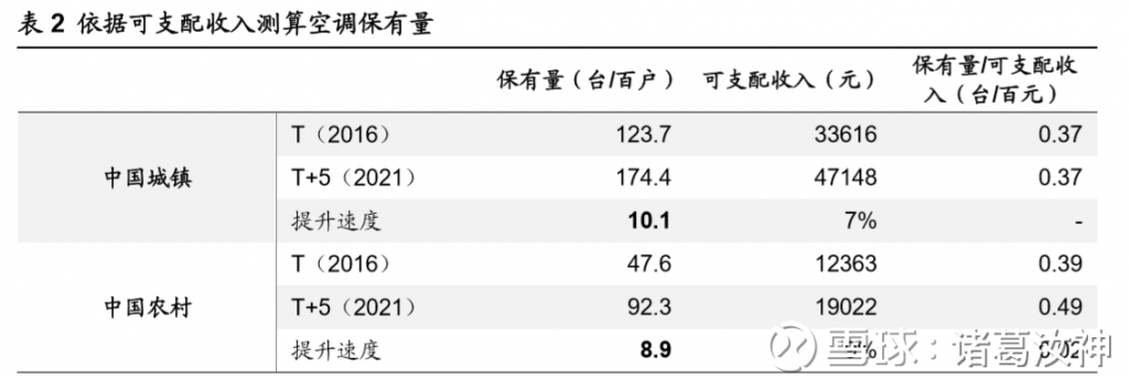 2016 年中国城镇百户保有量为 123.7 台,对标 1989 年,日本百户保有量为 113 台,未来 5 年 中国可支配收入的增速如果按照过去三年的平均速率则在 7%左右,日本这一时期的可支 配收入增长率则仅有 3.4%。因此我们假设中国城镇保有量提升的速度略高于日本这段时 期的保有量提升速度,则未来 5 年空调保有量提升速率为城镇每年 11 台/百户,2021 年 中国城镇空调百户保有量约为 178.7 台。同理以中国农村对标城镇,2016 年农村百户保 有量为 47.6 台,与 2002 年的城镇水平相近,人均收入增速略低于城镇。5 年间城镇平 均每年保有量提升 8.8 台/百户,农村在提升速率为 8 台/百户的情况下 2021 年百户保有量达到 92 台。