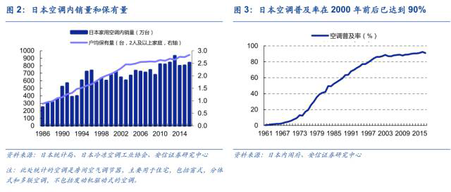 根据日本统计局的数据,从 1979 年到 2014 年,日本国民可支配收入从 157 万亿 到 291 万亿增长了一倍,空调百户保有量从 64.3 台上升至 272.3 台翻了 4 倍有余。