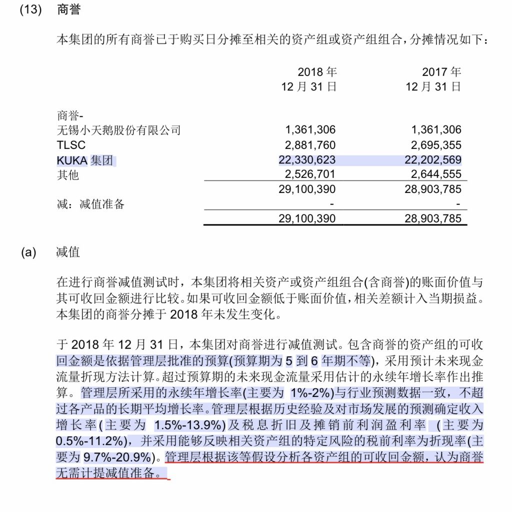 于 2018 年 12 月 31 日,美的集团合并资产负债 表中的商誉金额为人民币 29,100,390 千元,其中 包括收购 KUKA Aktiengesellschaft(以下简称 “ KUKA 集 团 ” ) 业 务 产 生 的 商 誉 人 民 币 22,330,623 千 元 以 及 收 购 Toshiba Lifestyle Products & Services Corporation( 以 下 简 称 “TLSC”) 业务产生的商誉人民币 2,881,760 千 元。我们关注收购 KUKA 集团及 TLSC 业务产生的商 誉合共人民币 25,212,383 千元的减值风险,因为 该等商誉的金额重大,而且商誉的减值测试涉及 重大的会计估计与判断。