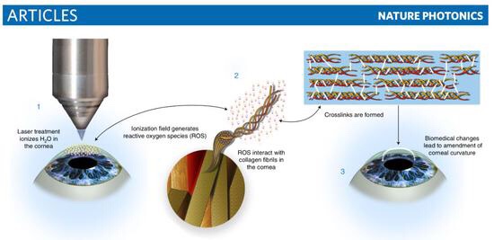 这几种常用的方法,虽然能立竿见影且效果持久,但它也具有较高的风险,有个别患者在术后出现了永久失明的现象。而且这个手术还受个人角膜条件限制,如果患者的角膜很薄,或者有干眼症等其他疾病,上面的疗法可能就不太适合了。Sinisa Vukelic和Chao Wang用的飞秒振荡激光,能量极低、振荡频率却极高,被照射的角膜区域,里面的水分子会电离,产生活性氧簇,活性氧与角膜里面的胶原蛋白发生反应,形成新的化学键或化学交联。就这样巧妙的改变了角膜的结构,改变角膜的曲率,而不破坏角膜。
