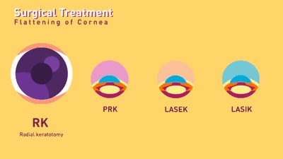 上面的四种手术从左到右依次为:放射状角膜切开术(RK),准分子激光角膜切削术(PRK),准分子激光上皮下角膜磨镶术(LASEK),准分子激光原地角膜消除术(LASIK)。据说激光在雕刻的时候,会有一串轻响和一点烧灼的气味。