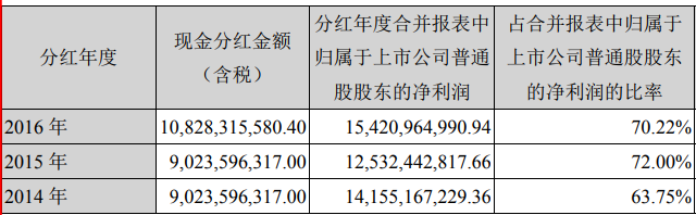 2015年7月3日实施了2014年度分红方案:按公司总股本3,007,865,439股计,向全体股东每10股派发现金30.00元(含税),共计派发现金9,023,596,317元,「73.8%的净利」