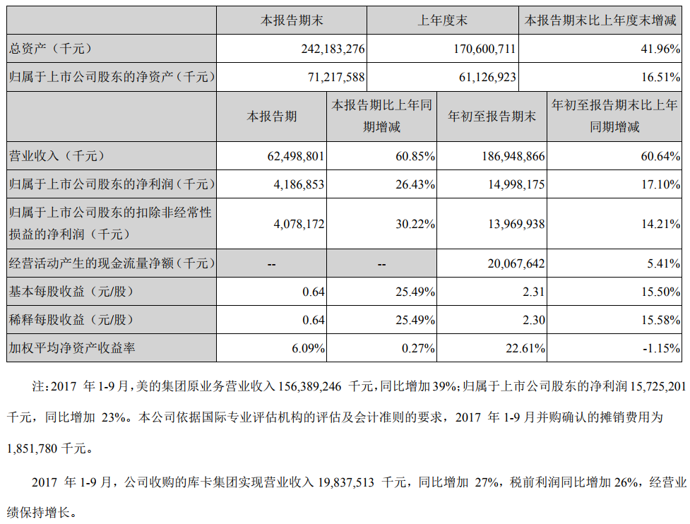 http://info.machine.hc360.com/2016/12/021117625336.shtml - 2016年10月31日美的集团发布2016年三季报,公司业绩增长超预期。2016年1-9月公司实现营业收入1163.78亿元,同比增长4.49%,实现归属上市公司股东净利润128.08亿元,同比增长16.31%;扣非后净利润122.32亿元,同比增长30.47%;基本每股收益2.00元,同比增长15.61%。