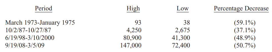 This table offers the strongest argument I can muster against ever using borrowed money to own stocks. There is simply no telling how far stocks can fall in a short period. Even if your borrowings are small and your positions aren’t immediately threatened by the plunging market, your mind may well become rattled by scary headlines and breathless commentary. And an unsettled mind will not make good decisions.