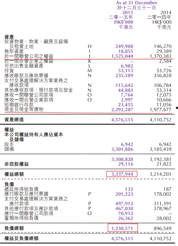 資產總值為4,576,500,000 港元,而於二零一四年十二月三十一日則為 4,110,800,000港元。其中短期銀行存款以及 現金及現金等價物為 2,315,700,000 港元, 佔資產總值 50.6% 。於百富環球之權益為 1,525,000,000港元,佔資產總值33.3%。於二 零一五年十二月三十一日,本集團於百富環球之 32.7%實際權益之公平值約為2,908,400,000港 元。[$7.99 at the time, now it is $5.4; val=1,965M]