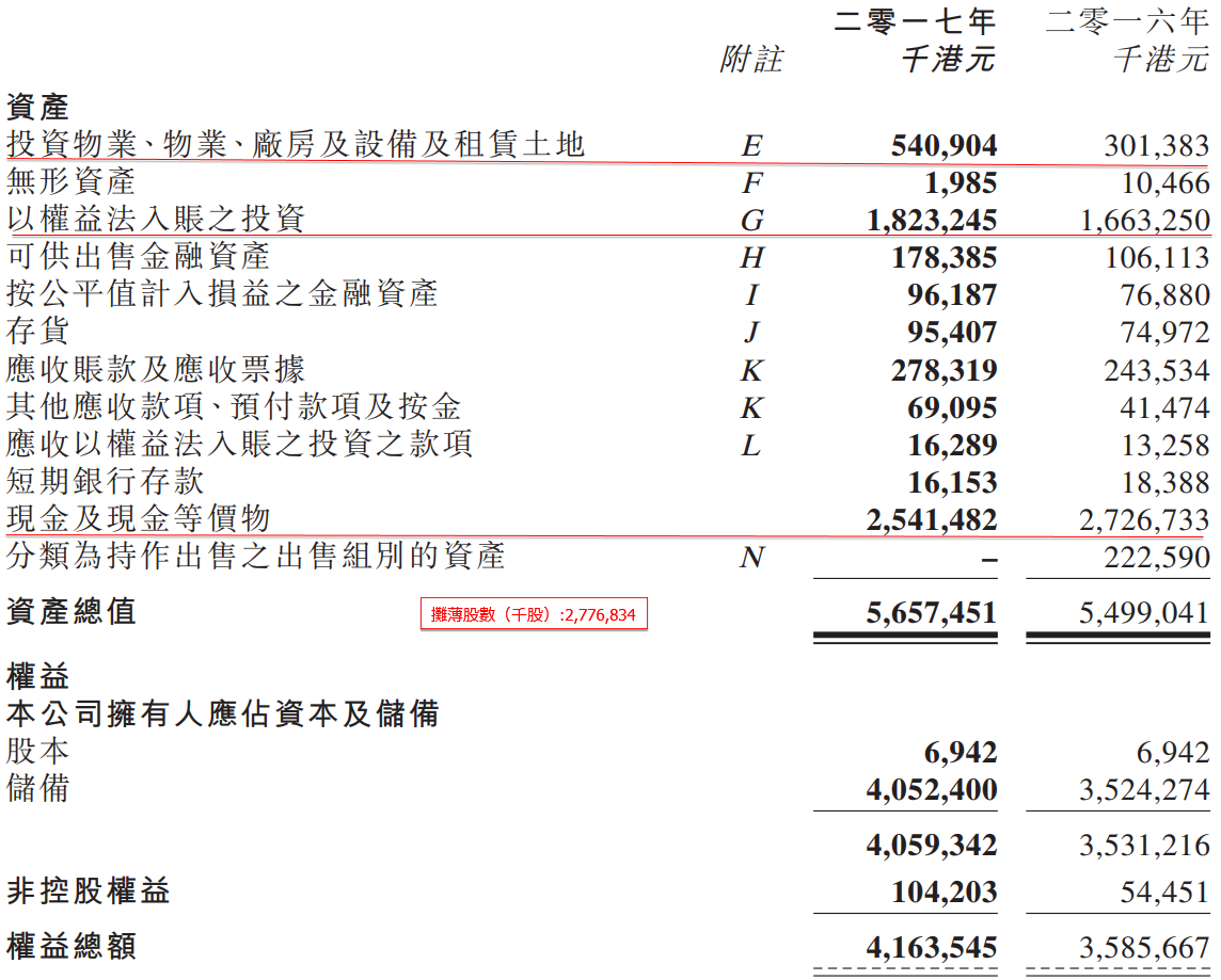 本集團權益之賬面值為1,823,245,000港元(二零一六年:1,663,250,000港元)。公平值乃按於結算日之活躍市場現時價格釐定。