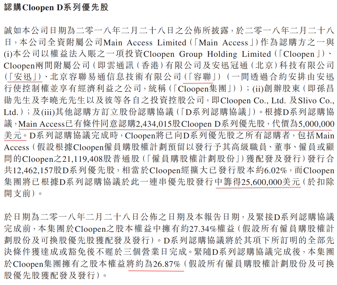 於二零一六年六月十日,本公司一間附屬公司 認 購 7,443,326 股 Cloopen C 系 列 可 換 股 優 先 股, 代 價 為 10,000,000 美 元。