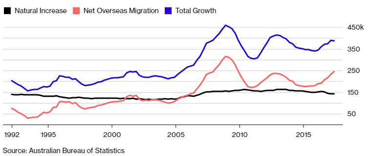 A flood of arrivals that’s swelled the population by 50 percent over the past three decades has underpinned economic growth and allowed a succession of governments to boast of avoiding recession since 1991. Populists are blaming immigrants for over-burdened infrastructure, soaring housing prices and low wage growth.